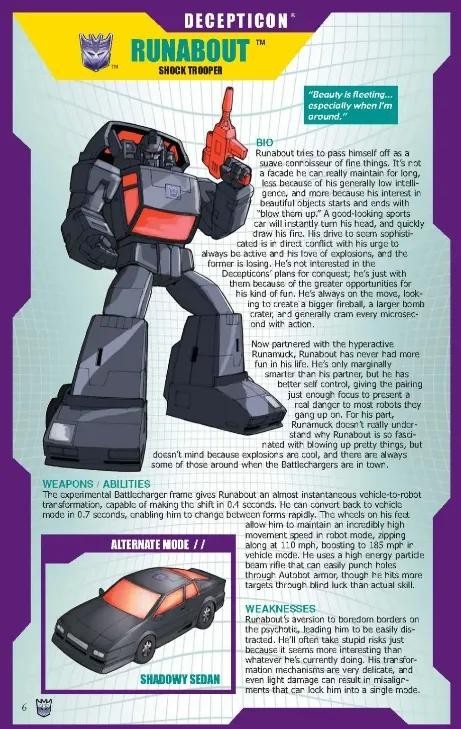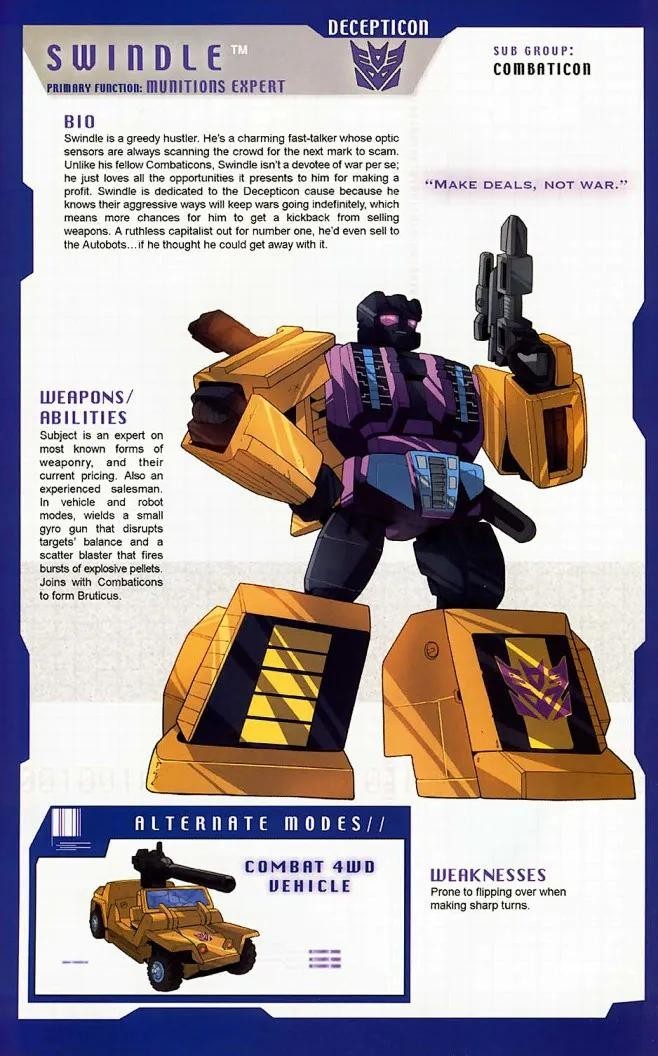 胆小而懦弱的三段变形战士,对战斗充满恐惧的他常常利用其的变形优势逃跑和伪装自己。而得过且过的生活态度也使他得以左右逢缘于博派与狂派之中。
