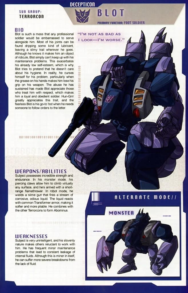 关于污点的形象问题,汽车人和霸天虎的意见空前的一致:除去令人恐怖的外表,污点浑身散发的恶臭实在让人难以忍受。污点所到之处,都会留下恶臭的印记,那些是从他的关节处溢出的润滑油。别人的厌恶情绪和污点的自卑情结,影响了他的交际能力。他甚至不能流利地说完一句完整的话。他知道自己是大家嘲讽的目标,但他却找不到任何方式来缓解他的尴尬和痛苦。污点不善言谈,但是沉默并不代表他无能。浑身的蛮力,以及对霸天虎的事业的无比忠诚使他成为令人畏惧的怪物。