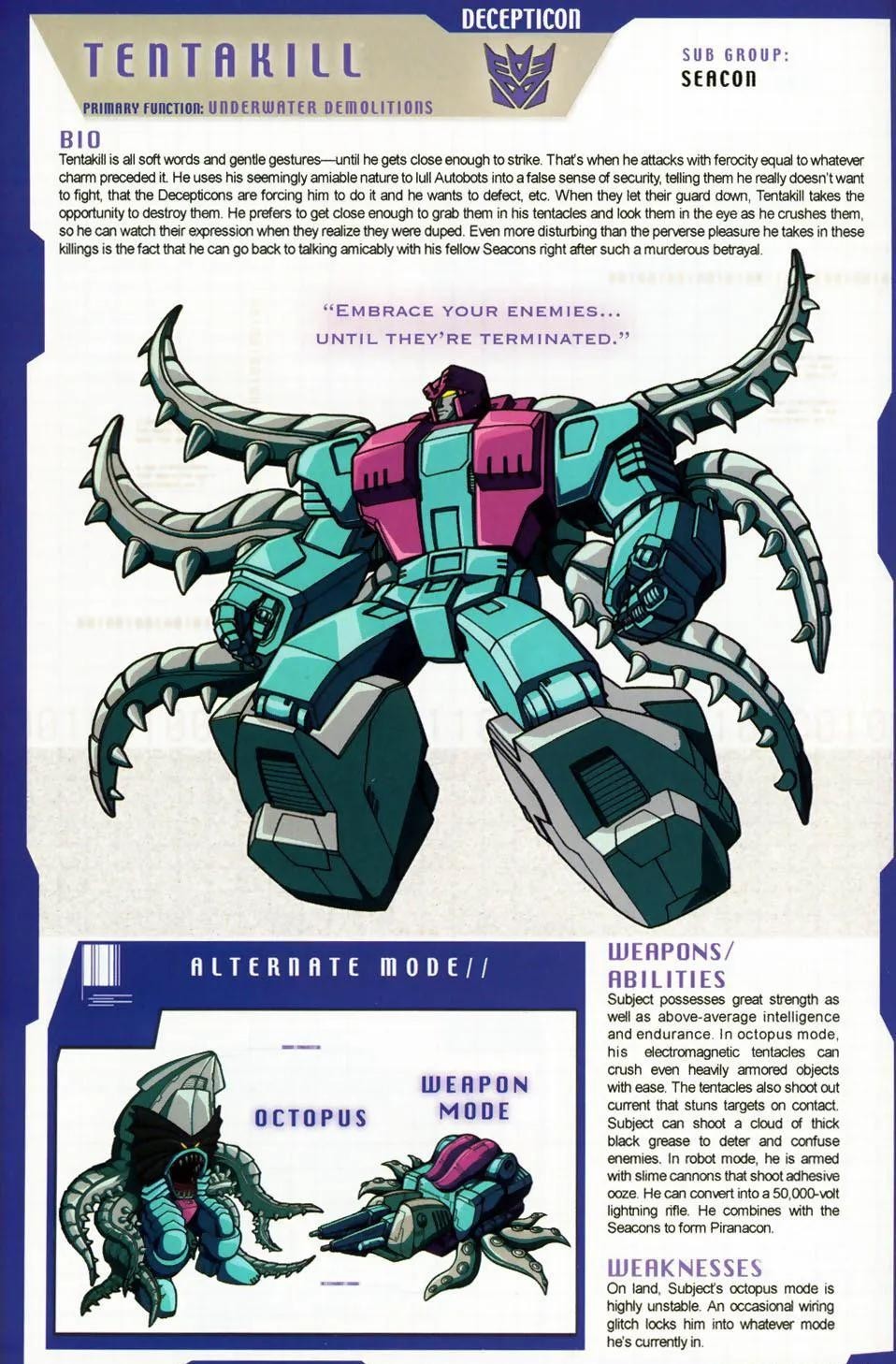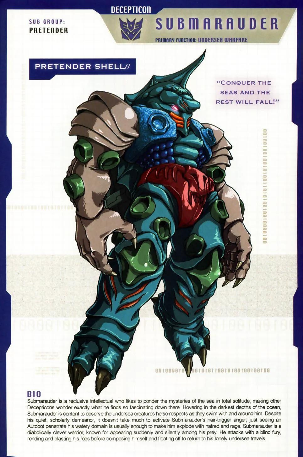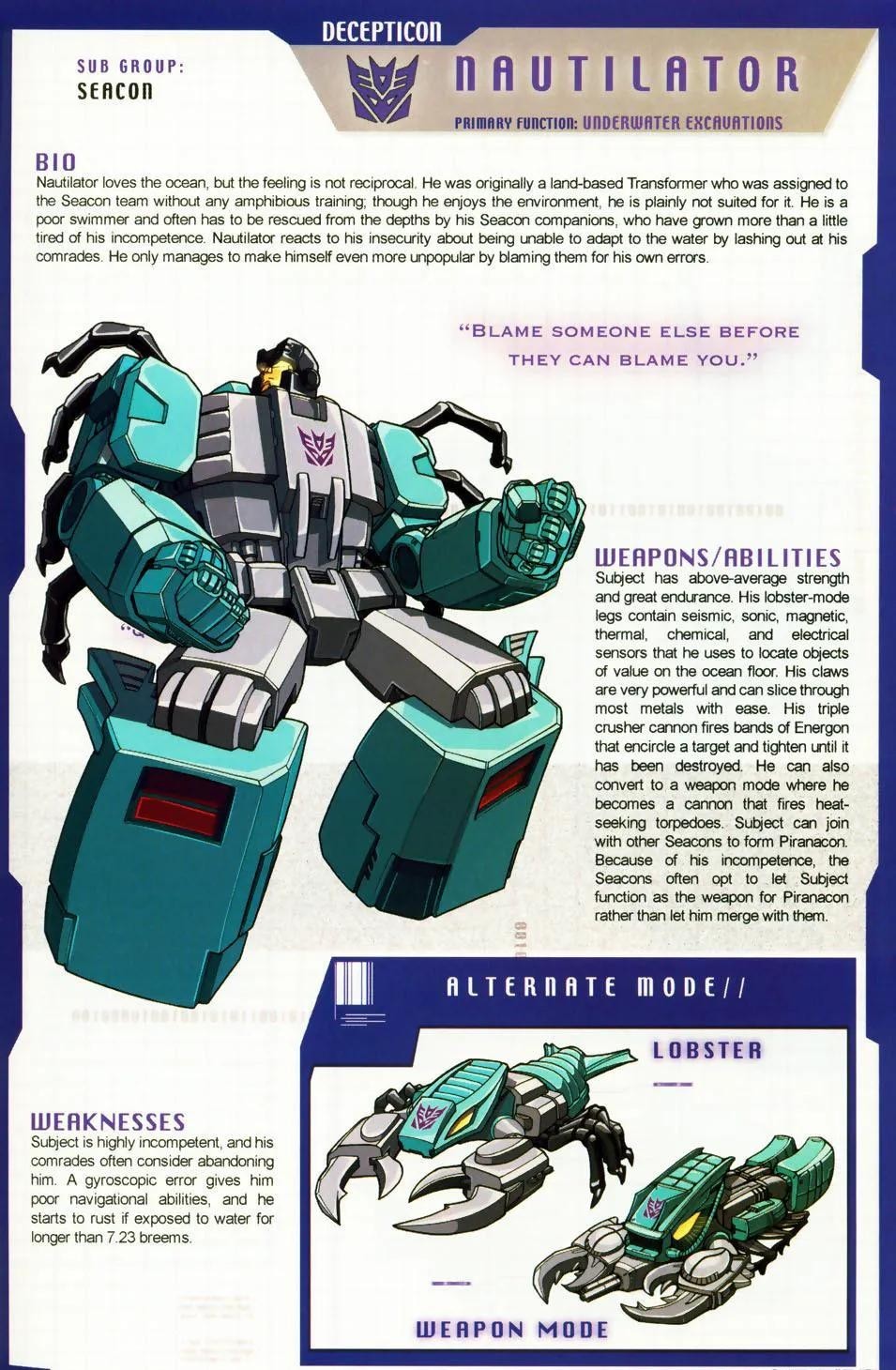 网爪妖是海洋战士中最会伪装的一个,他总是一幅和颜悦色的样子接近目标,然后突然发动攻击。一边说着自己厌恶战争,是霸天虎逼着自己上阵,非常痛苦,一旦汽车人将枪口下垂,他就会一跃而起将对手摧毁。