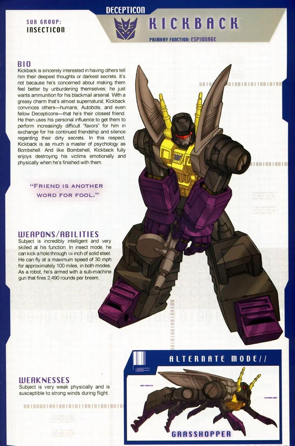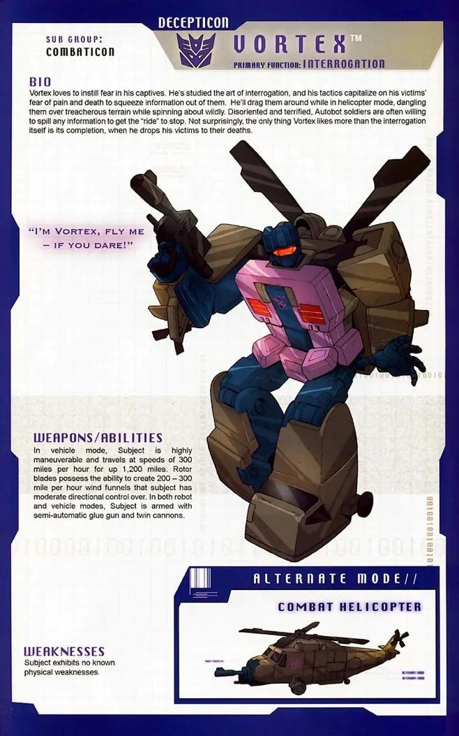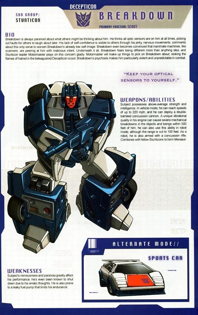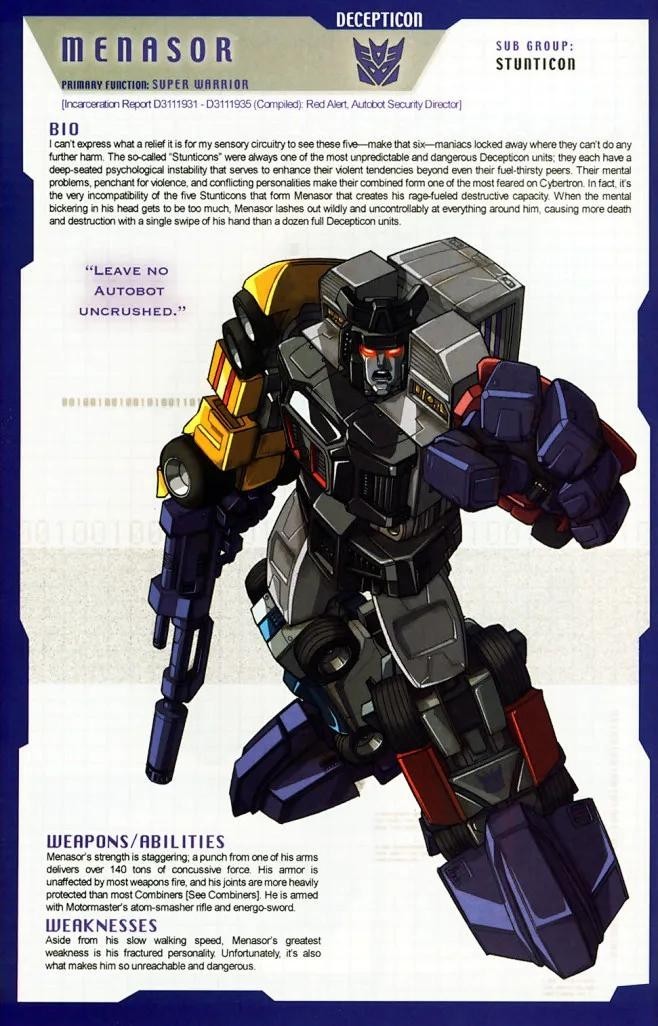霸天虎成员,担任陆空指挥官,所属部队是三变金刚,以“先毁灭再思考”为格言。