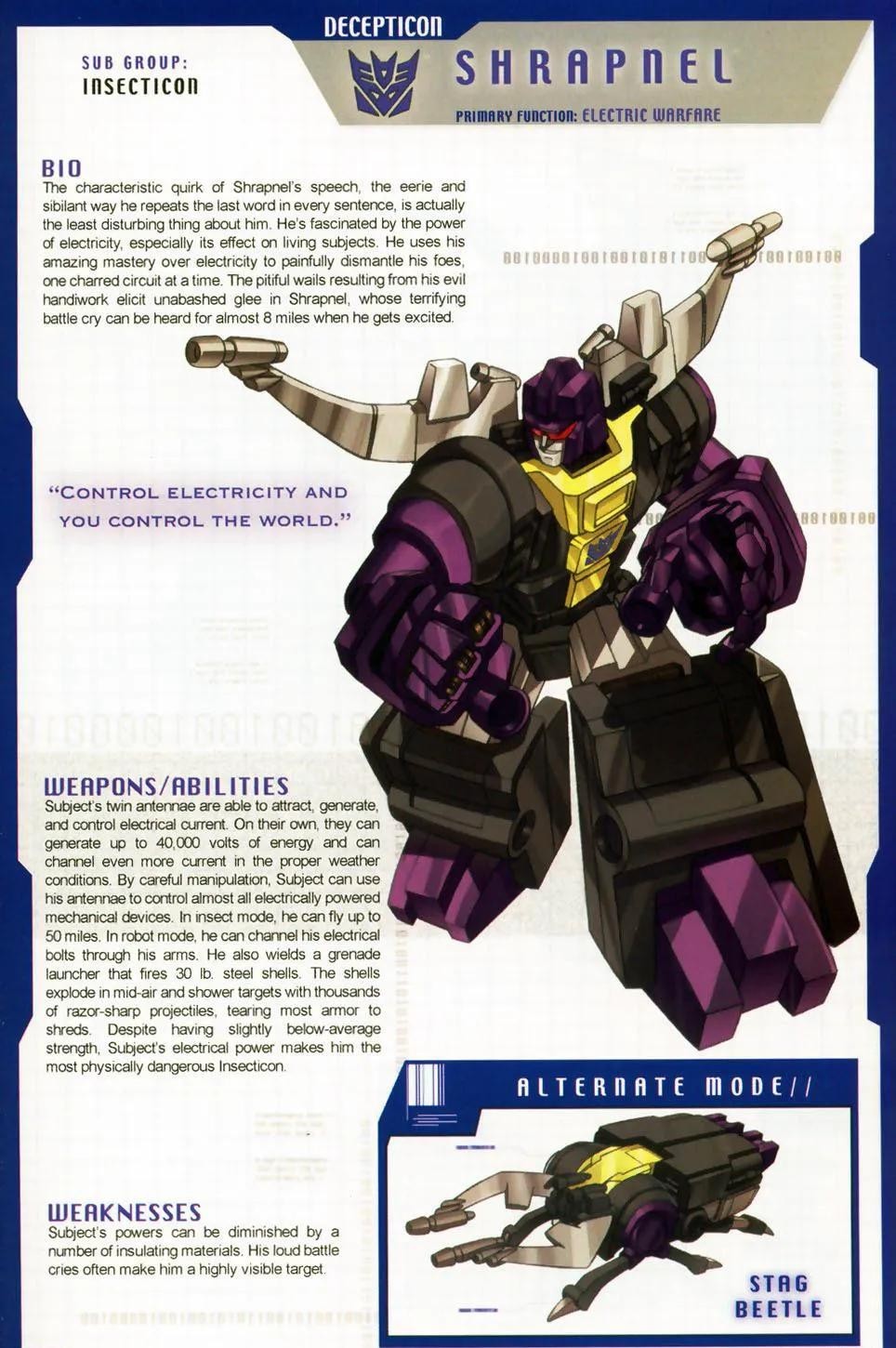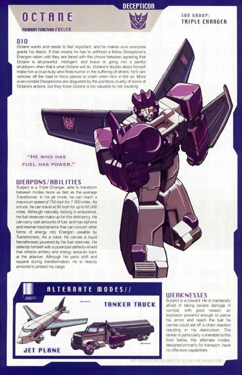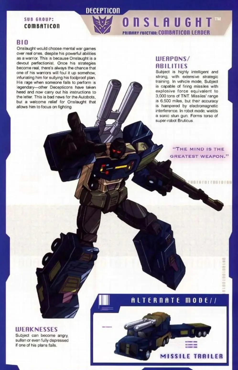 霸天虎成员,担任陆空指挥官,所属部队是三变金刚,以“先毁灭再思考”为格言。