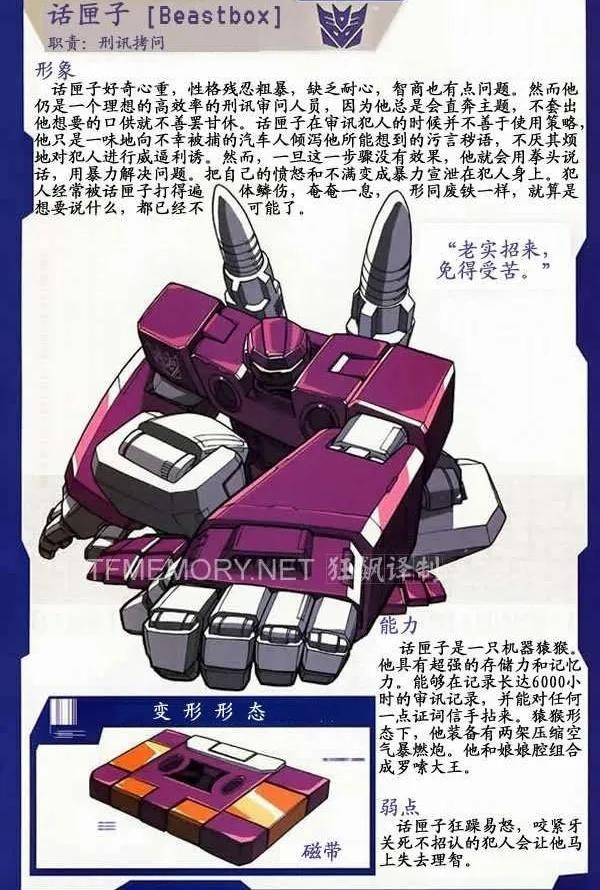 话匣子是霸天虎成员,隶属于声波的磁带军团,能够变形为磁带,十分狂躁易怒。
