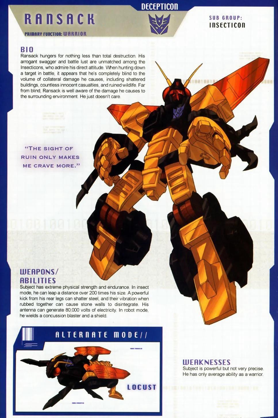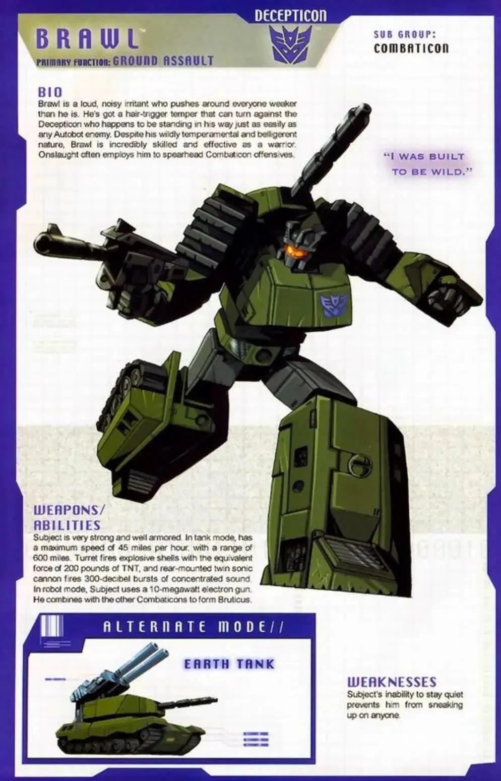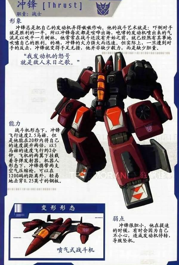 霸天虎成员,拥有惊人的耐力和抗击打能力,可变形为喷气式战斗机,格言是“把会飞的统统撞下去”。