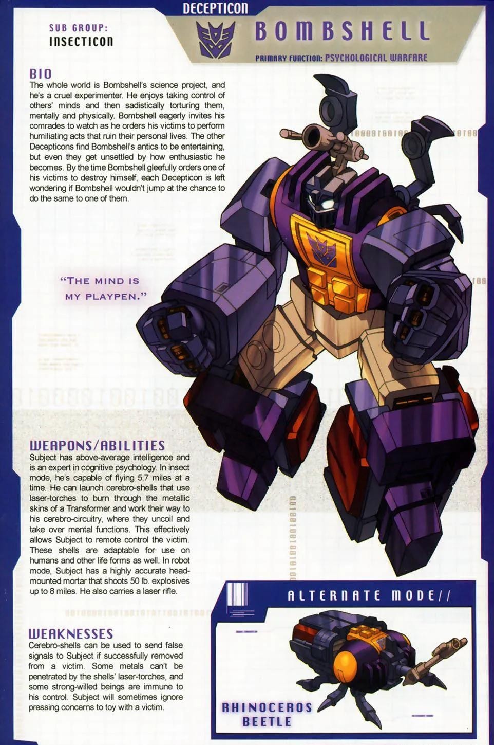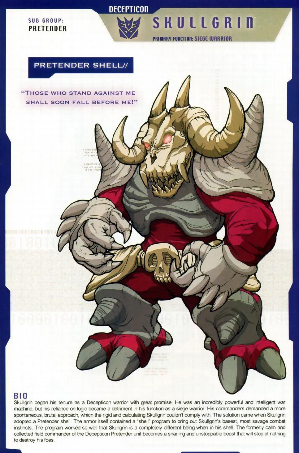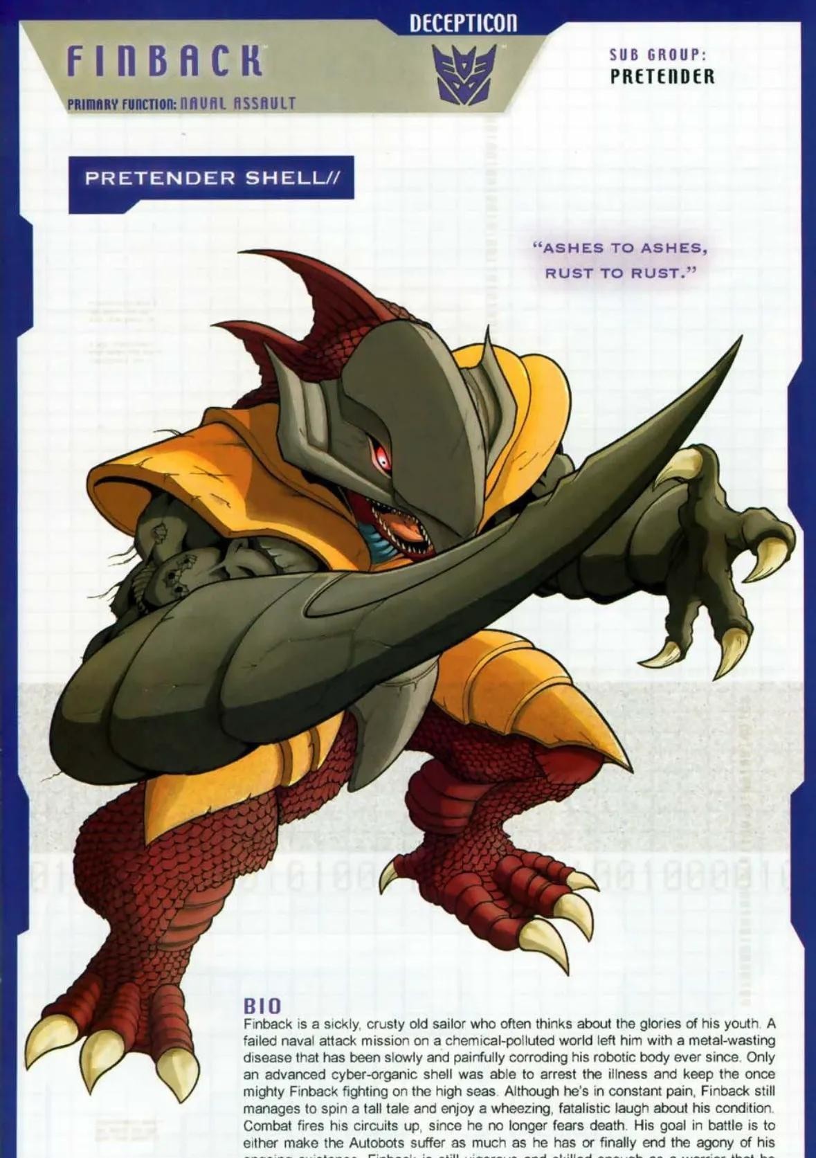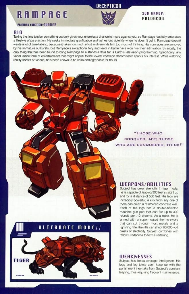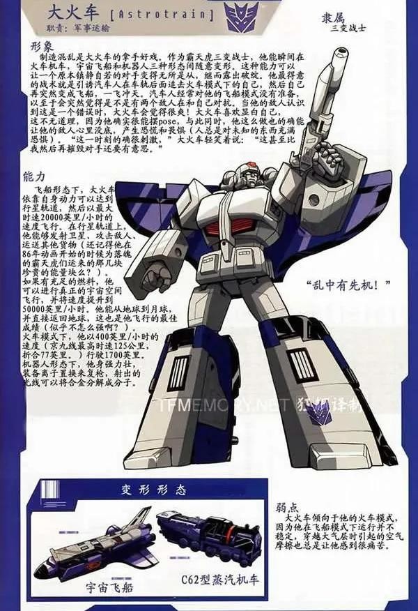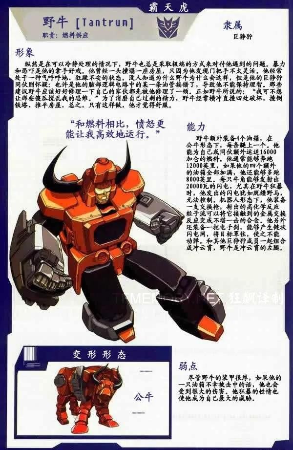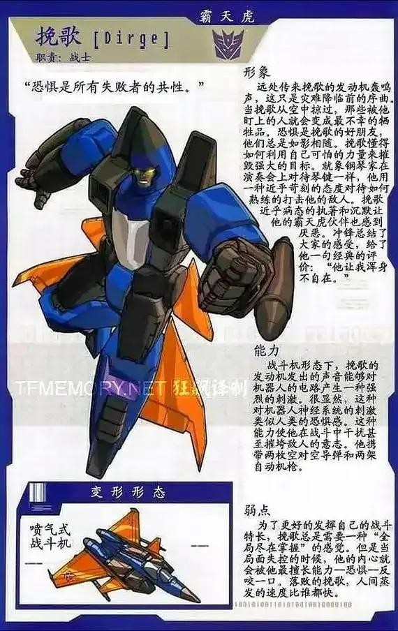 霸天虎成员,性格自负,以戏剧性登场震慑敌人为乐,战前狂轰滥炸宣告其到来,但实战策略不及挽歌,且常在关键时刻逃避危险。