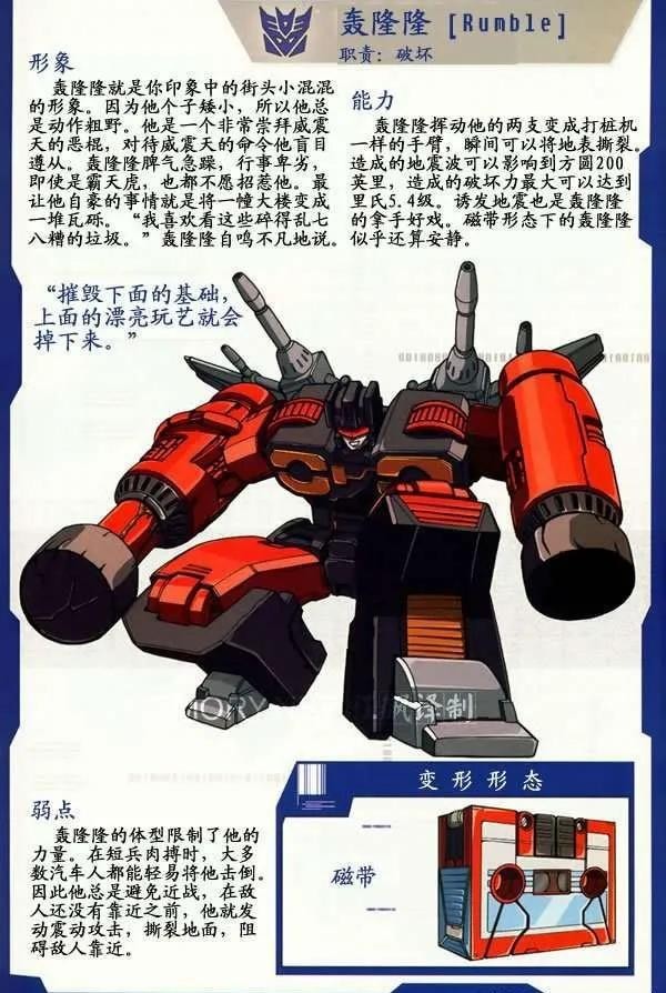 轰隆隆隶属于声波的磁带军团。他虽然身材矮小,在肉搏战中很吃亏,但是能制造地震,能轻易摧毁大楼,是霸天虎的重要破坏力量。