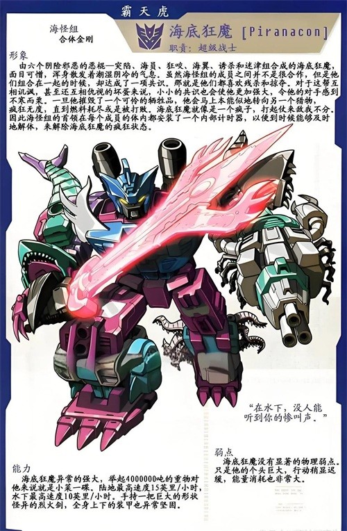 冲云霄,由五名巨狰狞合体而成的超级战士,拥有强大攻防能力,但常因野兽本能而无法冷静,是霸天虎的重要战斗力,曾在多次战役中大放异彩。