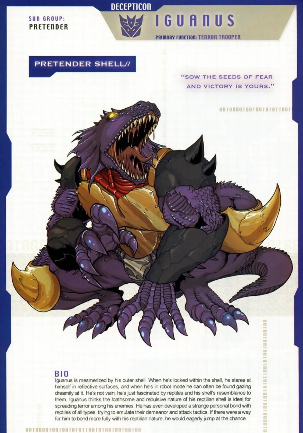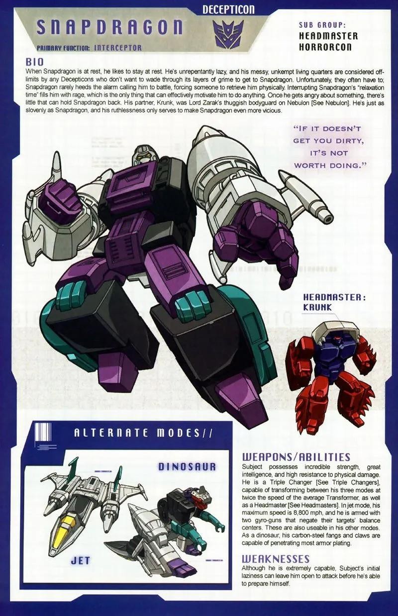 鳄龙是霸天虎头领战士的一员,可以变形成为机械美洲鳄,耐力和体力极强,不过头脑也很迟钝。