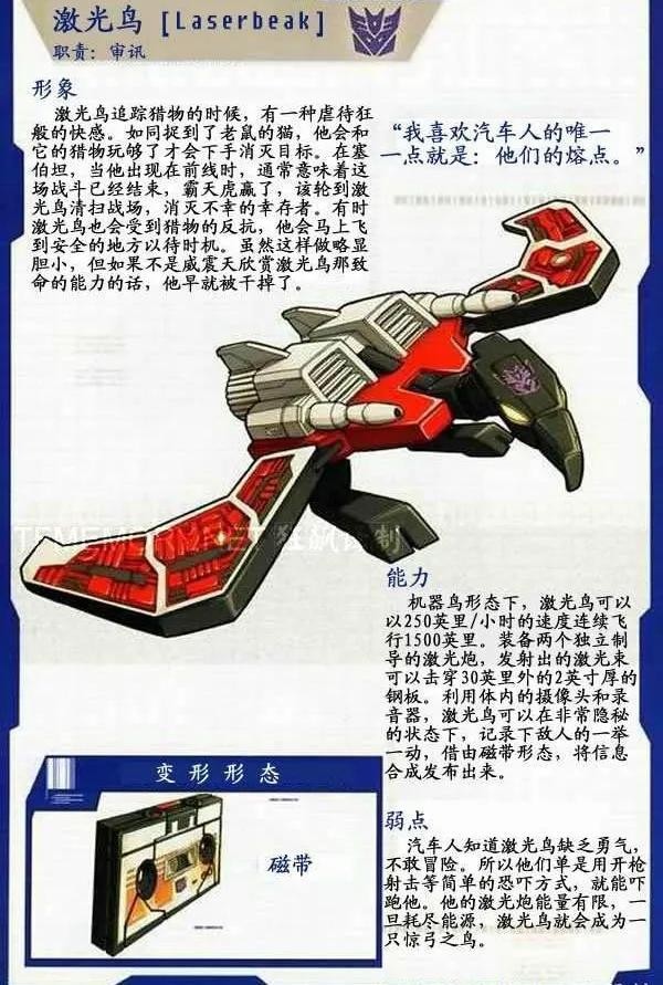激光鸟是霸天虎战士,声波的磁带部队成员,是个出色的间谍,曾多次进入汽车人的内部获取重要情报。