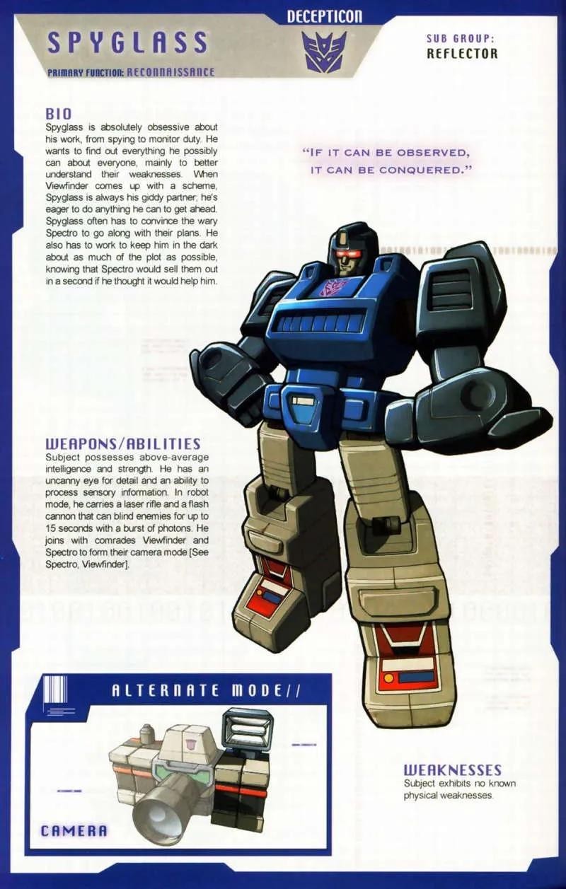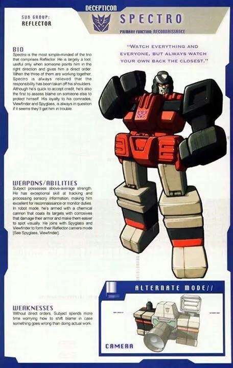 分光镜,隶属于霸天虎,照相机部队三个成员之一,可以与反光镜和聚光镜一起变形为照相机。