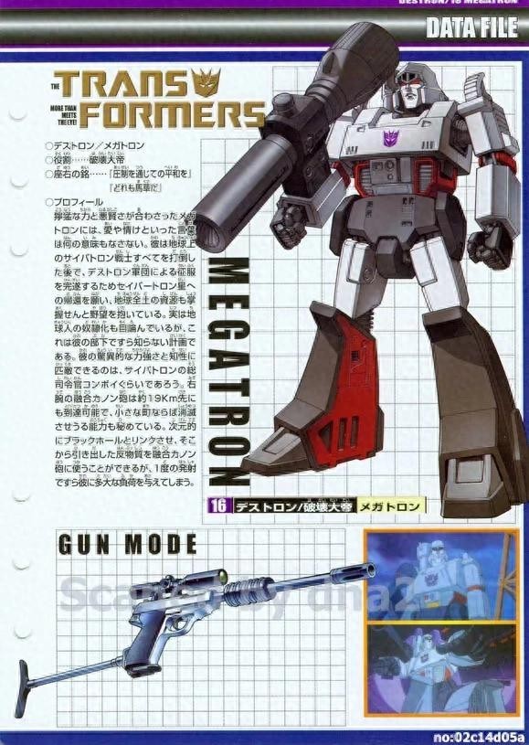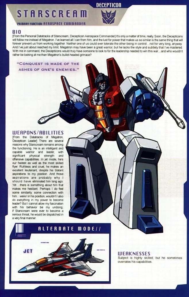 霸天虎心狠手辣的首席首领,在最经典的G1动画里可变形为P-38式手枪,他的载具通常是喷射机、坦克或战斗机。在塞伯坦内战再度爆发时,他成为了霸天虎的首领,擎天柱的死敌。