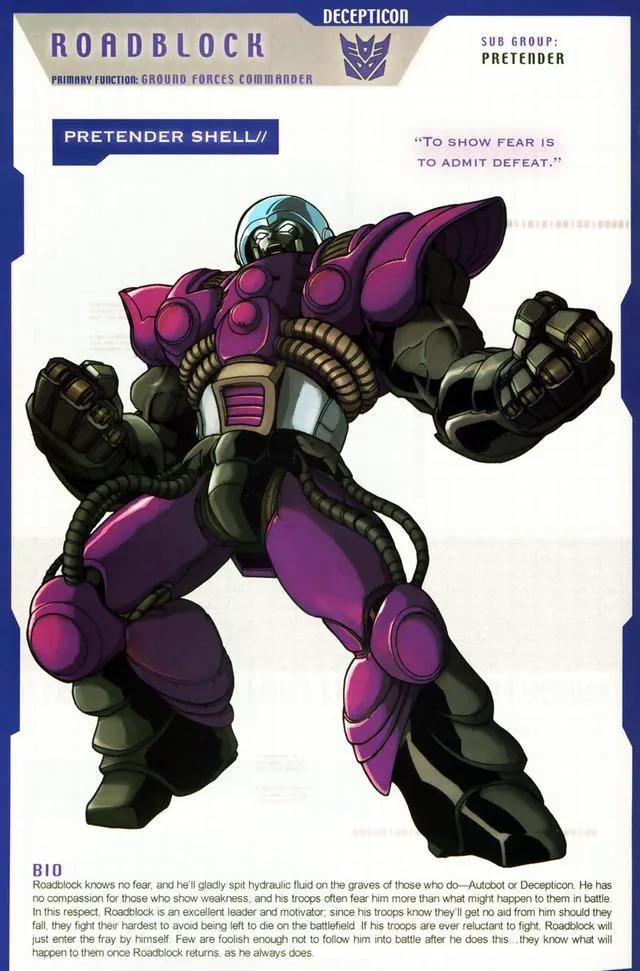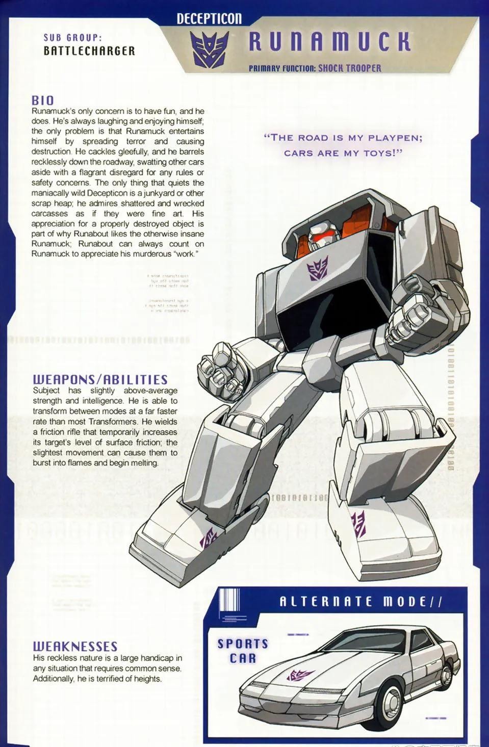 性格直率,行为粗野的霸天虎勇士,以疯狂的速度驰骋于公路之上的汽车大师号称公路之王。与多数霸天虎不同的是,他除了战斗外也非常看重自己作为一名霸天虎战士具有的荣誉。