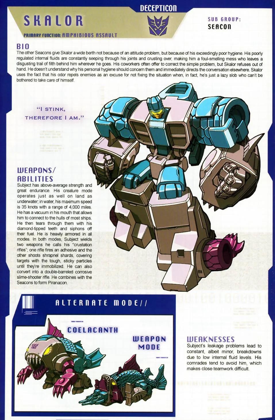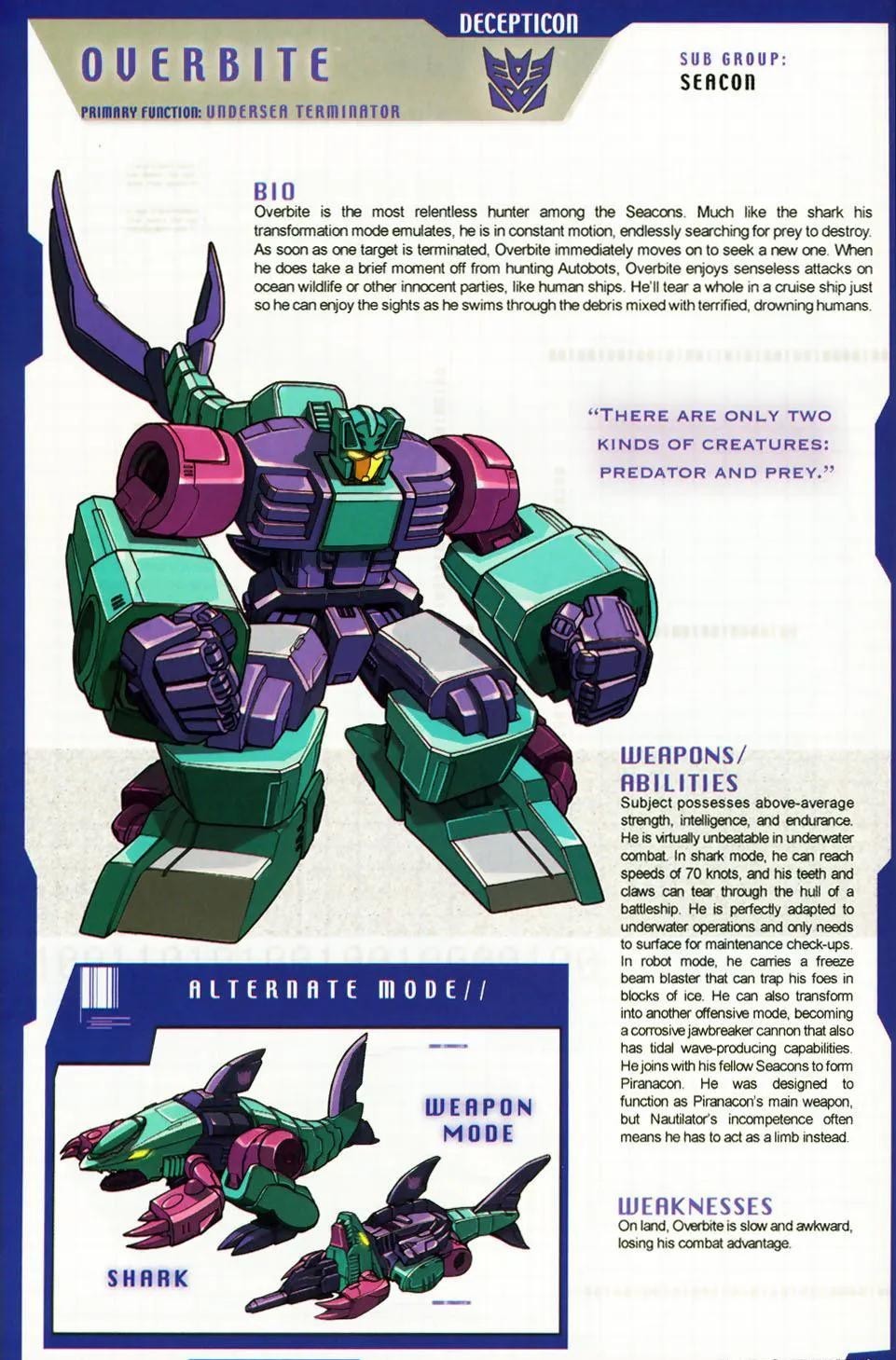 碎尸鲨的自卑感就像他的狂派标志一样明显,这一点除了他自己其他人都清清楚楚。碎尸鲨一贯仇恨所有比他还“低级”的生物,特别是汽车人。对方的存在令他恼怒不已,最重要的原因是他们的“软弱”让他联想到自己。尤其是在看到碳基生物或闻到他们的气味时,尤令碎尸鲨恼怒,亟欲除之而后快。受到怒意的激发 ,碎尸鲨的攻击无比猛烈,战斗力大幅提升。不过,再大的破坏也没法令他过瘾。