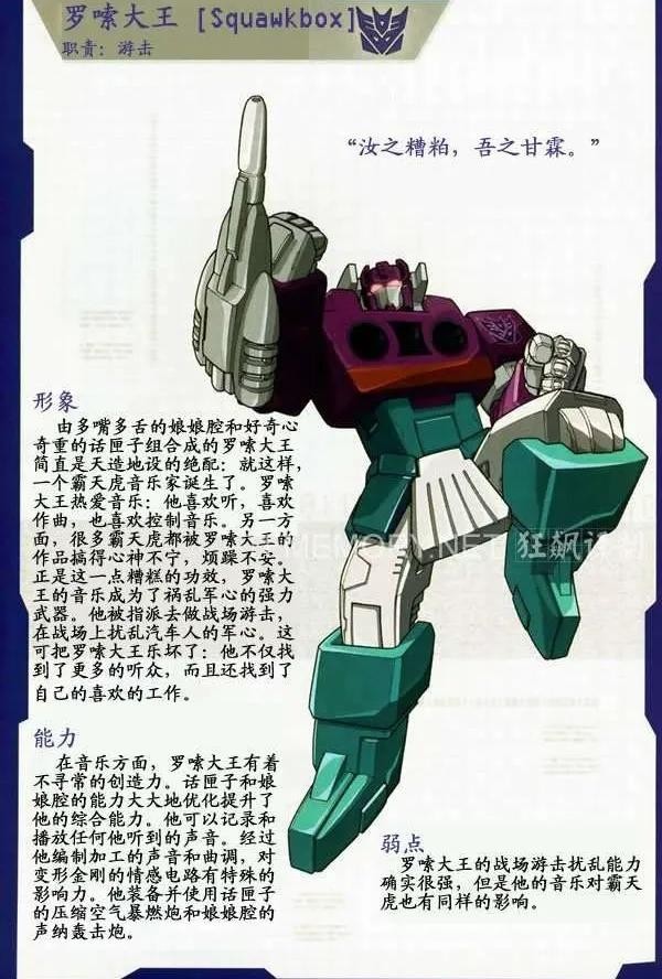 声波是霸天虎的情报参谋,侦察专家,掌握组织内所有的情报交流,是威震天不可或缺的副手之一。