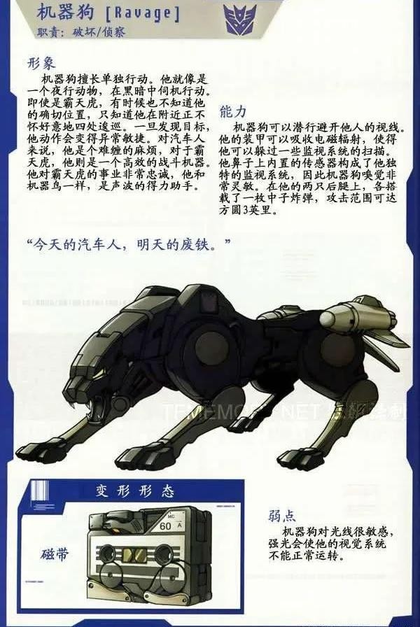 机器狗的造型实际上是一只类似黑豹的猫科动物,可变形为磁带,声波的得力助手。