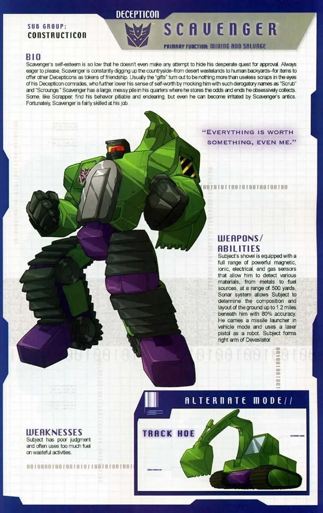 铲土机具有令人惊赞的高超技术,以至于他几乎可以设计或生产霸天虎所需要的任何建筑和机械。面对一片赞美之词,铲土机也会显得羞赧而谦逊。出于自己的施虐兴趣,充满艺术天赋的铲土机往往会将被打败的汽车人俘虏拿来装饰自己的建筑物。这不仅令自己和伙伴们无比开心,同时也使他成为最受同僚欢迎的霸天虎战士。