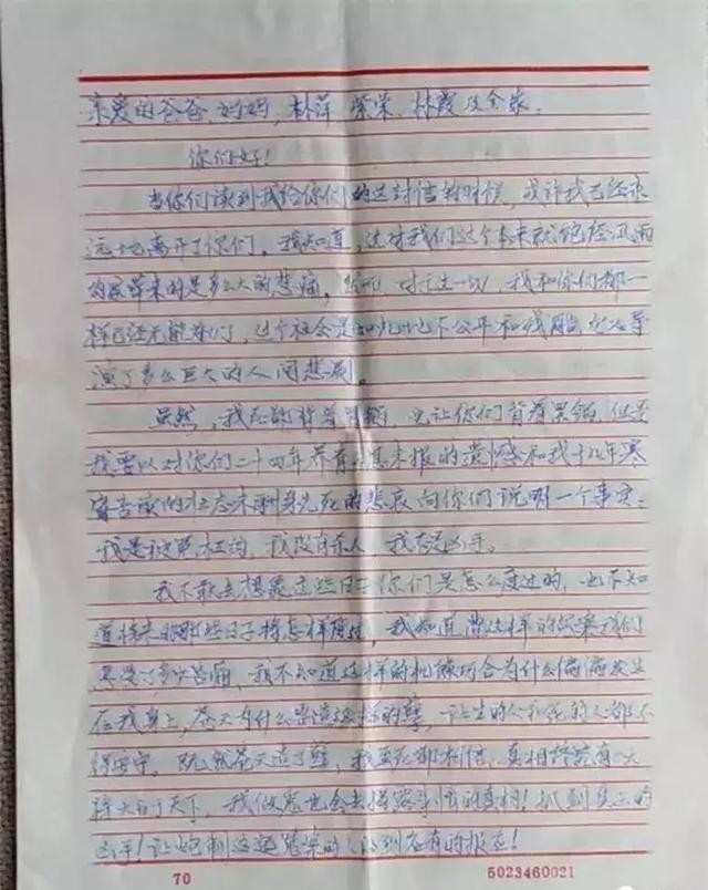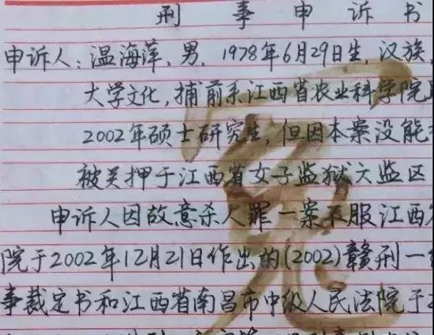 温海萍告诉记者,2002年9月9日,收到南昌中院的死刑判决后,他怀着绝望的心给父母留下了遗书,表达对父母24年养育之恩未报的遗憾,和自己十多年寒窗苦读壮志未酬身先死的悲哀,并向父母禀告一个事实:“我没有杀人,我不是凶手”。