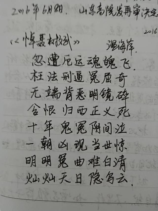 温海萍在狱中写日记,偶尔也写诗。当时他是从报纸上看到聂树斌案的,诗是在狱中写的,很多狱警和狱友知道温海萍的冤情,有关冤案的报道就会留给他看,他平时也收集了很多报道。