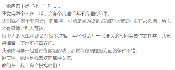 曹曦文说:“她应该不是小三,我和陈思诚不合适。我很喜欢佟丽娅,希望他们幸福。”