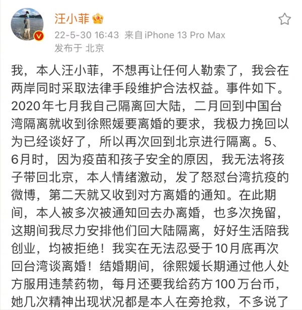 “S与我商谈离婚为去年2月份的事情,此后我多次往返两岸处理离婚和生意问题,隔离五次。期间因情绪问题的确出现过酒后失态,照片也为朋友所拍,在此向大家道歉,至于台媒狗仔说的出轨多位女子更是子虚乌有的事情,我已经委托律师团队在台湾提起诉讼。”