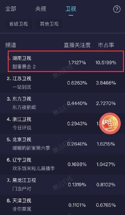 酷云实时直播关注度1.7+,实时市占率破10%,全国卫视第一。