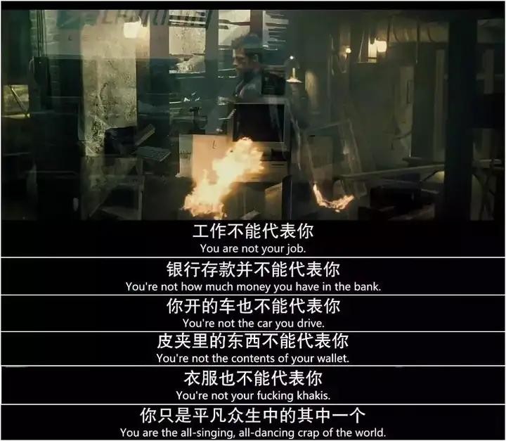 You're not your job. You're not how much money you have in the bank. You're not the car you drive. You're not the contents of your wallet. You're not your fuking khakis. You are the all-singing, all-dancing crap of the world.