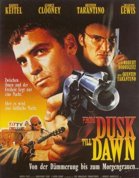 2.《杀出个黎明》,哇,这个电影真的简直了。没想到温文尔雅的乔治克鲁尼还接了这种片子,另外昆汀还有出演男配。昆汀把一个入狱多年没见过女同胞甚是想念的变态演出神了(有可能是本色出演啊哈哈,毕竟最近乌玛瑟曼不是也告他虐待了嘛)。刚开始以为就是个越狱加西部片,酒吧里的牛仔们各种牛❌武器,有拉裤裆量左轮的,有秀刀法的,各种昆汀天马行空的想象都在里面。就在女招待诱惑昆汀的时候你突然发现这尼玛还是个行尸走肉片啊!画风一转,这个酒吧成了阎罗洞,什么招待啊,老板啊变换形态,蛇精,僵尸,突然就放大招。最后剩的几个真有本事的人一起抵抗,最终杀了出去。实话说,感觉这个片子是昆汀最没内涵,纯炫技的电影,不过酣畅淋漓倒是真的,就是有点重口。