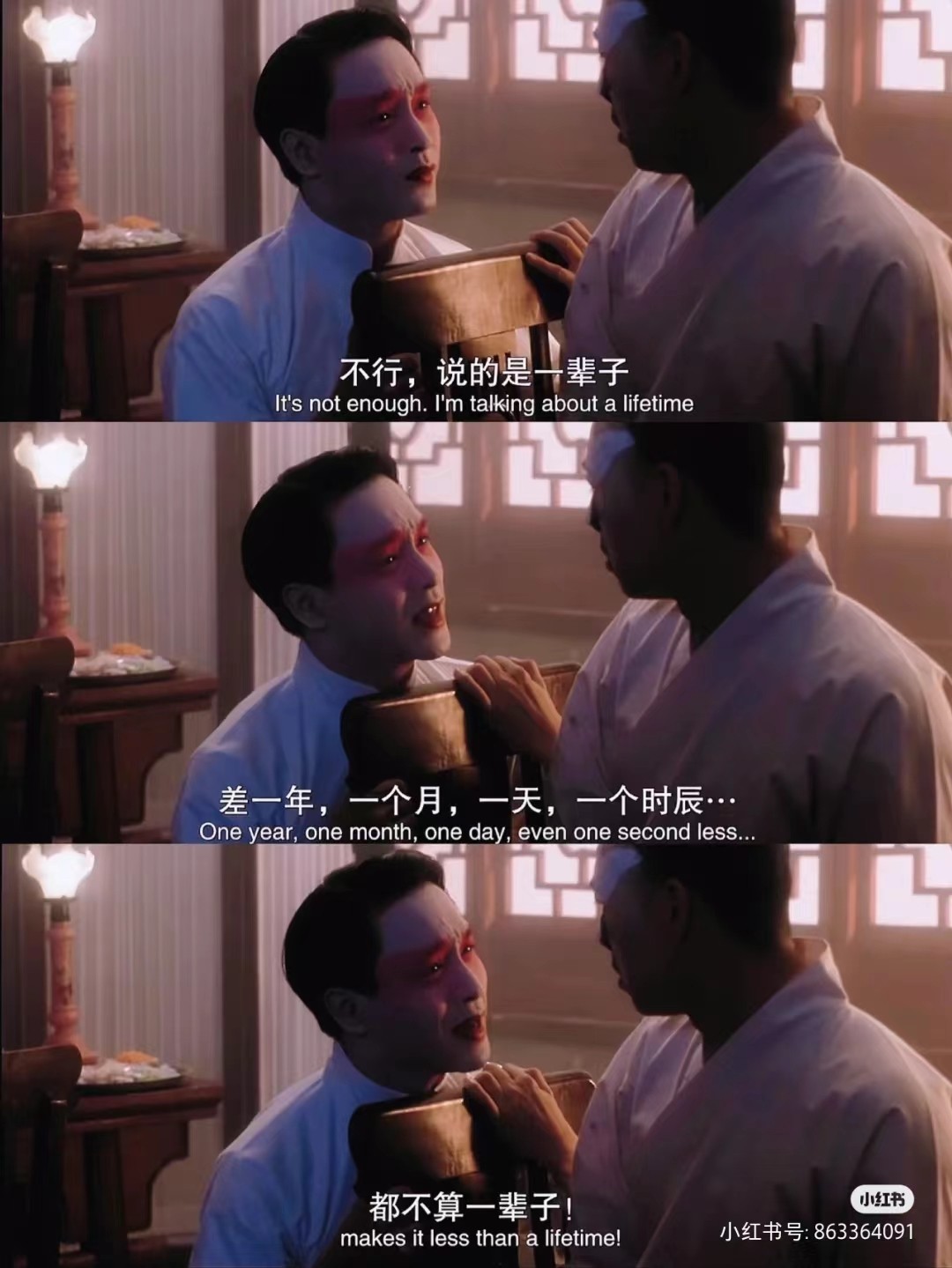 最后,影片的片名《霸王别姬》参考了程蝶衣在片中演绎的同名京剧中的著名台词。这句台词由妃子的角色说出,是对她的爱人和国王的凄美告别,象征着他们关系的牺牲和挣扎。这句台词,以及整部电影,讲述了艺术的力量和人类精神,即使在逆境中也能忍受。