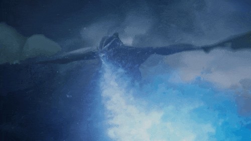 夜王骑着尸化的韦赛里昂,蓝色龙焰融化冰封的城墙。