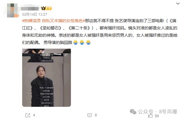 同档期的男导演张艺谋已经连续在三部作品《满江红》《坚如磐石》《第二十条》中都涉及了性侵的情节,镜头无一例外都对准了受害者。