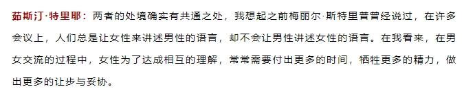 导演引用了女演员斯特里普的一段话:人们总是让女性来讲述男性的语言,却不会让男性讲述女性的语言。