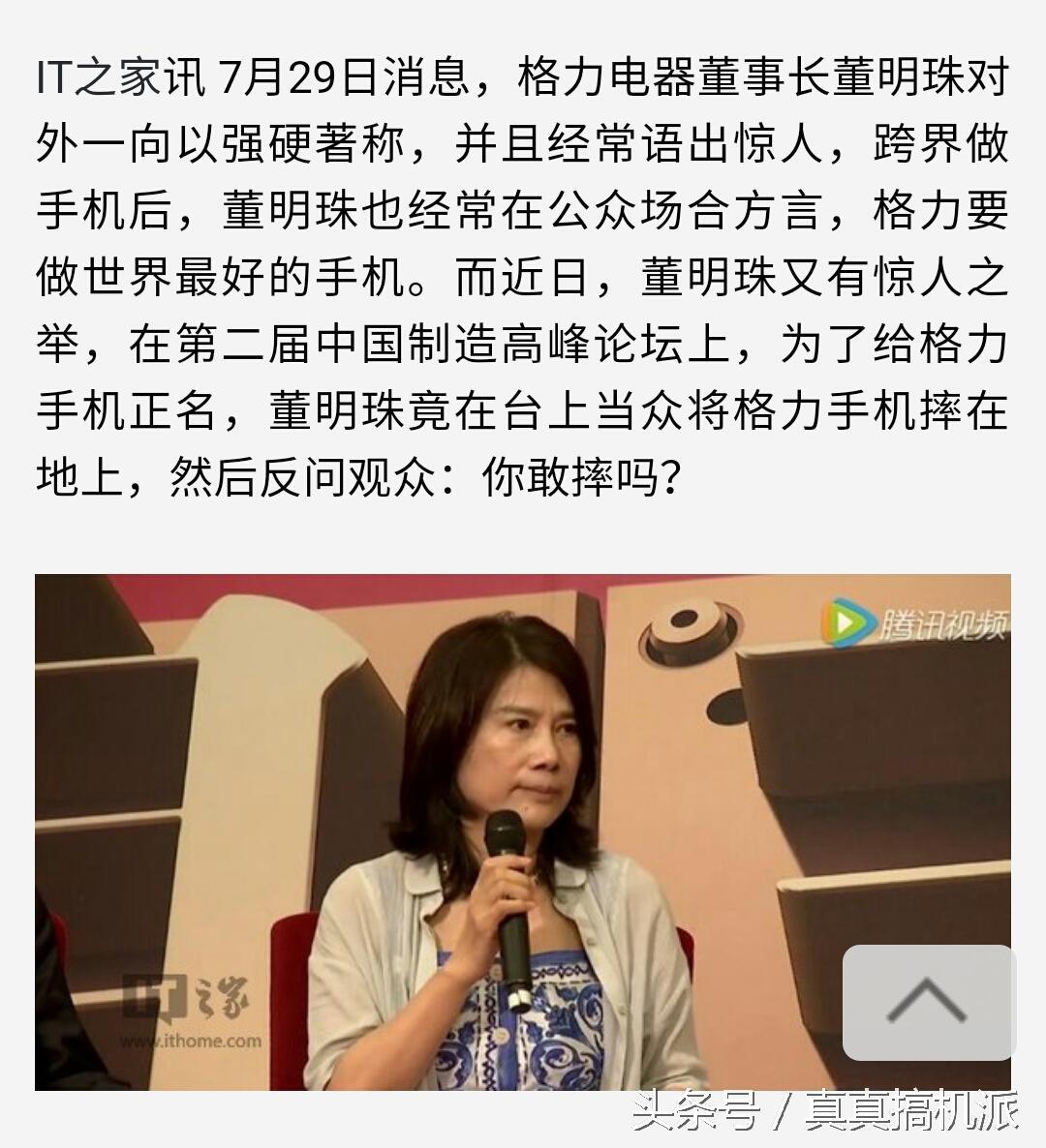 @IT之家消息,7月29日,在第二届中国制造高峰论坛上,董明珠怒摔格力手机,并撂下狠话:你敢摔吗?