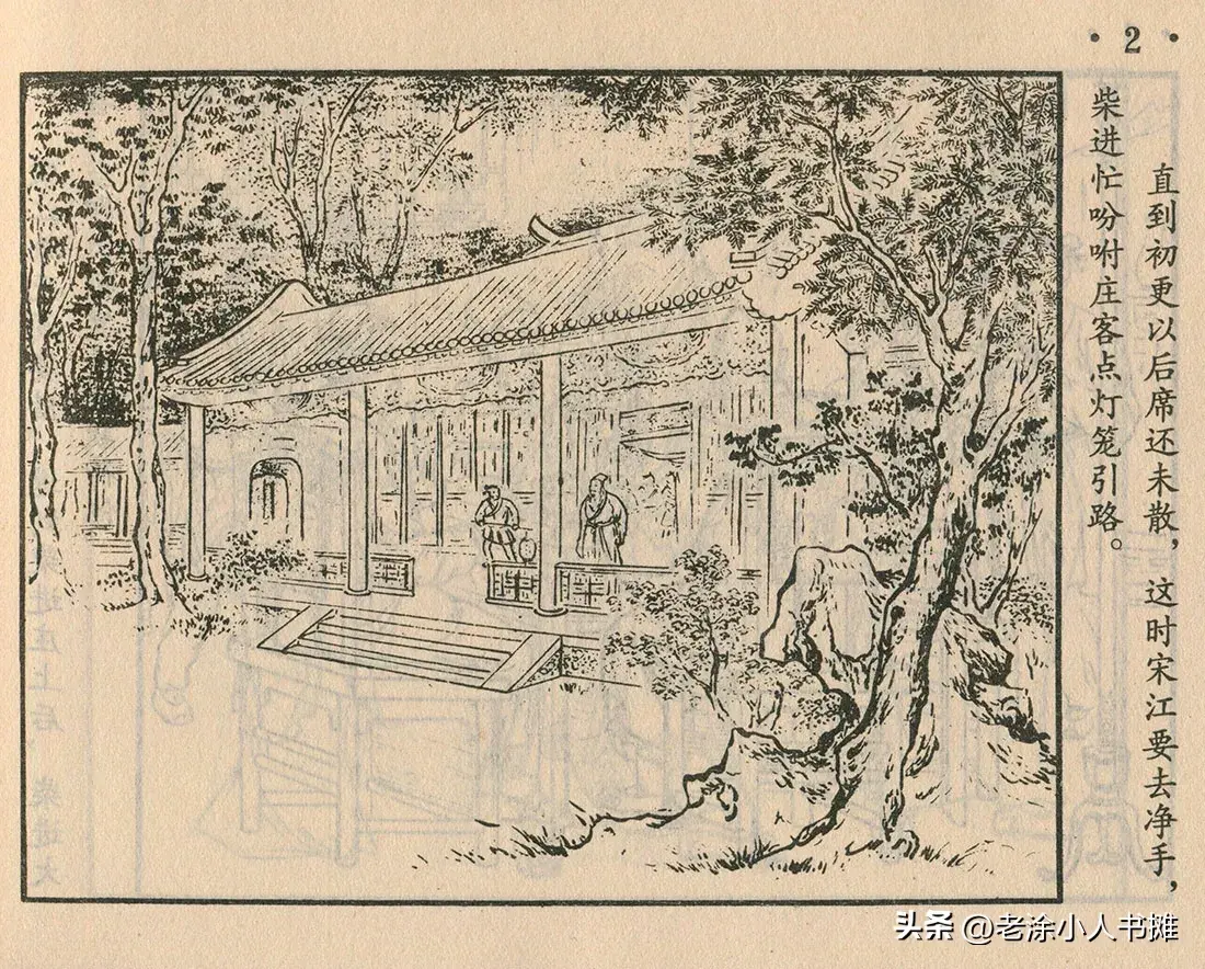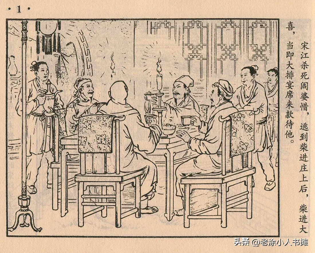 柴进宴请宋江。和80年代《水浒》连环画相比,这套书更有古典韵味,人物的衣饰,以及房屋家具等环境,都非常精致。