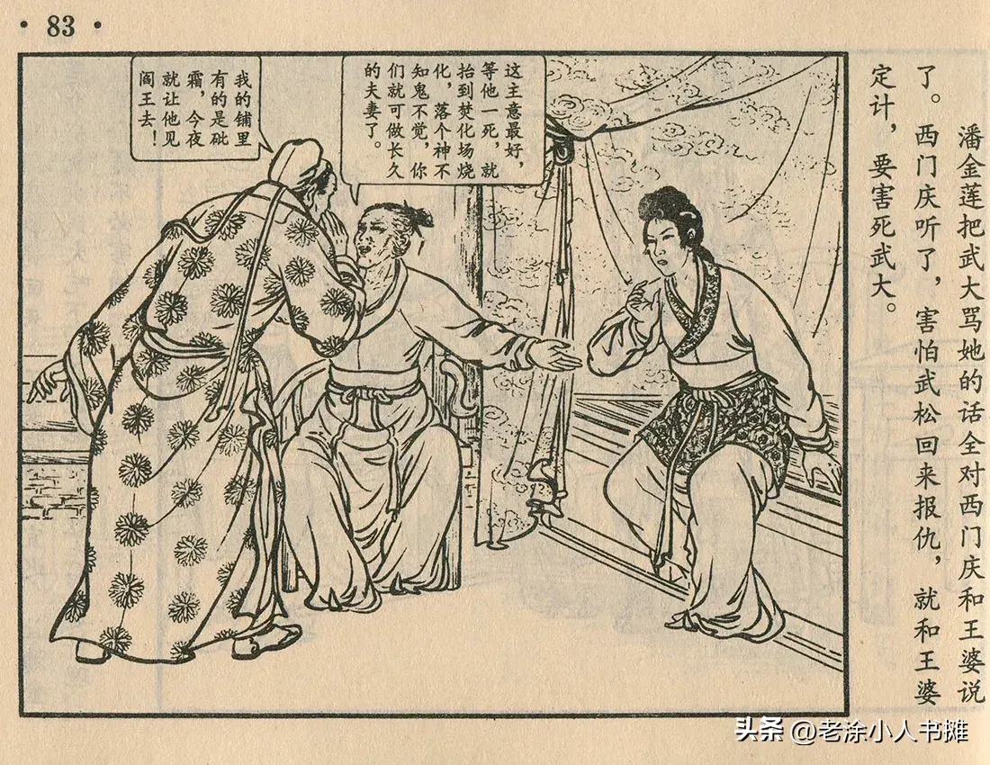 三人害怕武松回来报仇,密谋害死武大。其实这本书的潘金莲形象还是很朴素的,没有80年代戴敦邦绘画的那么妖娆多姿,更加魅惑。