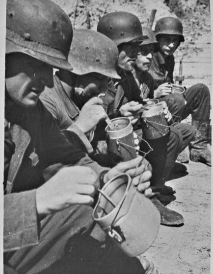 十,二战时,一群德国士兵正在吃饭,伙食还不错。