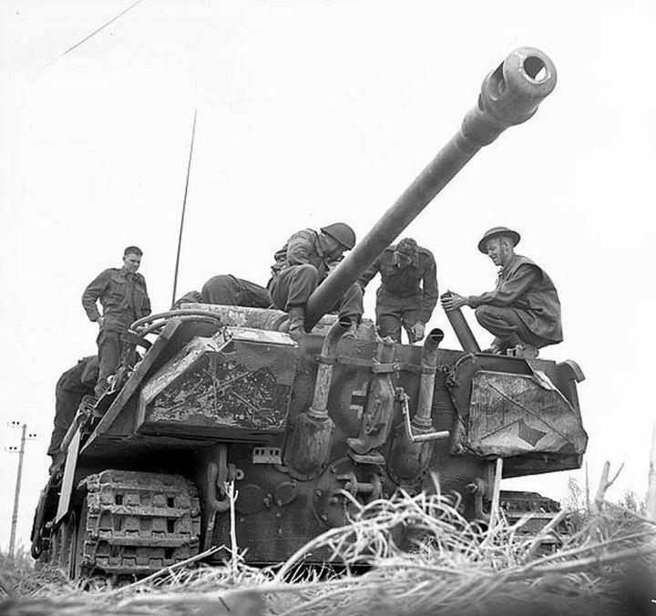 五,1944年7月9日,加军第7步兵旅与加军第2装甲旅的士兵正在检查奥蒂耶附近的一辆“豹”式残骸。这辆“豹”隶属SS第12装甲团第1连,炮塔号为135。