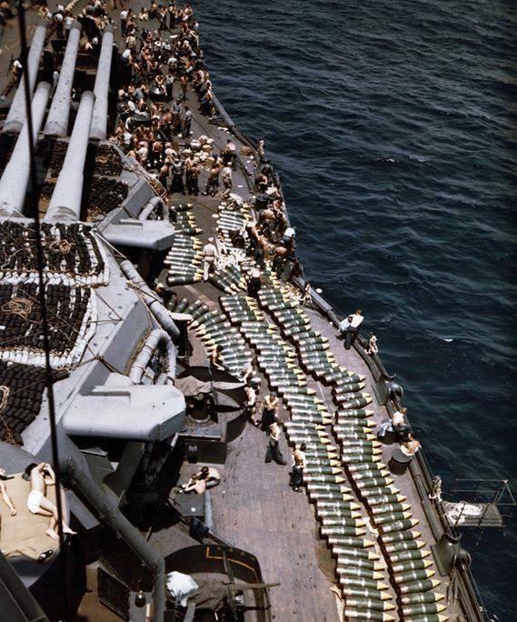 七,1944年6月30日,在进攻关岛之前,美国海军新墨西哥号在马绍尔群岛的埃尼维托克补给时,在右舷甲板上堆满了的14英寸炮弹。