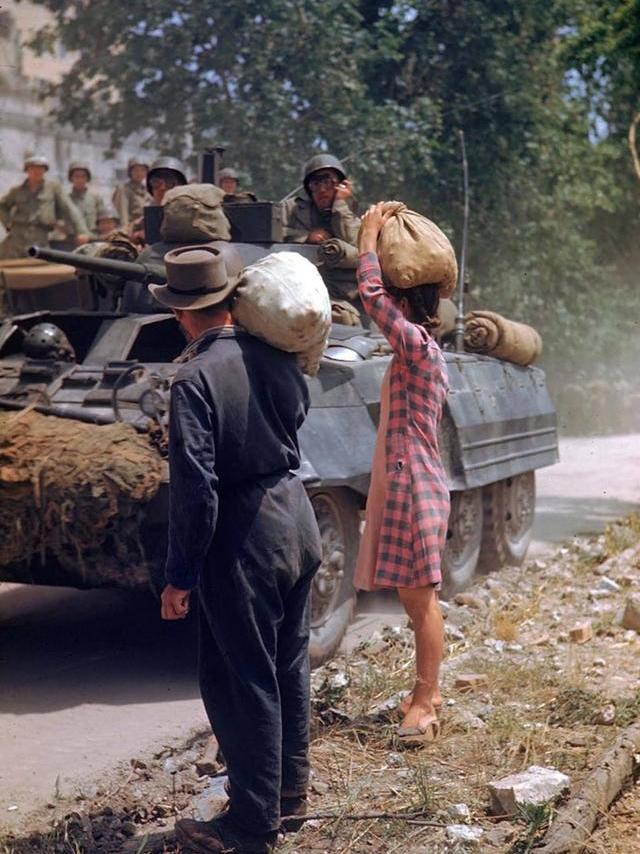 十六,第二次世界大战期间,意大利人在沿亚壁古道前往罗马的路上看着美国的装甲部队经过。