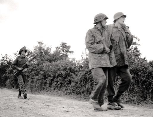 二,1944年7月9日的奥蒂耶,一名加军士兵正押送着2名来自SS第25装甲掷弹兵团的德军战俘。