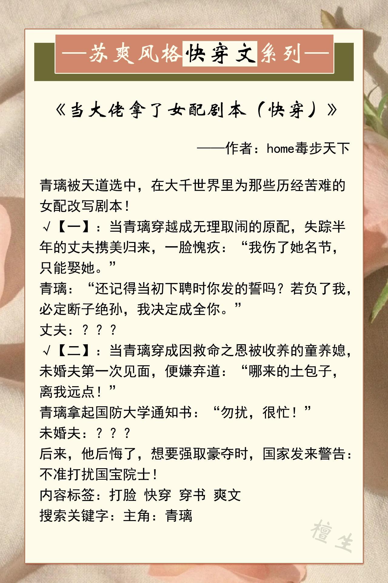 简评:女主青璃是天道选中的任务快穿者,目的就是穿越到三千世界里,为那些命运凄苦的女配们打脸虐渣主持公道的故事。女主代替一切心怀不甘的配角们崛起,摆脱命运的束缚,做自己人生的主宰者。每个小故事里女主从惨到强,用不同的惩罚方法让恶人得到恶报,同时也静侯花开,收获自己的爱情。这篇快穿文写法很套路,无功无过,依然是苏爽的风格,更有无数小惊喜隐藏在小单元里待人挖掘,喜欢洒脱又有韧劲的女主的不要错过这篇文。