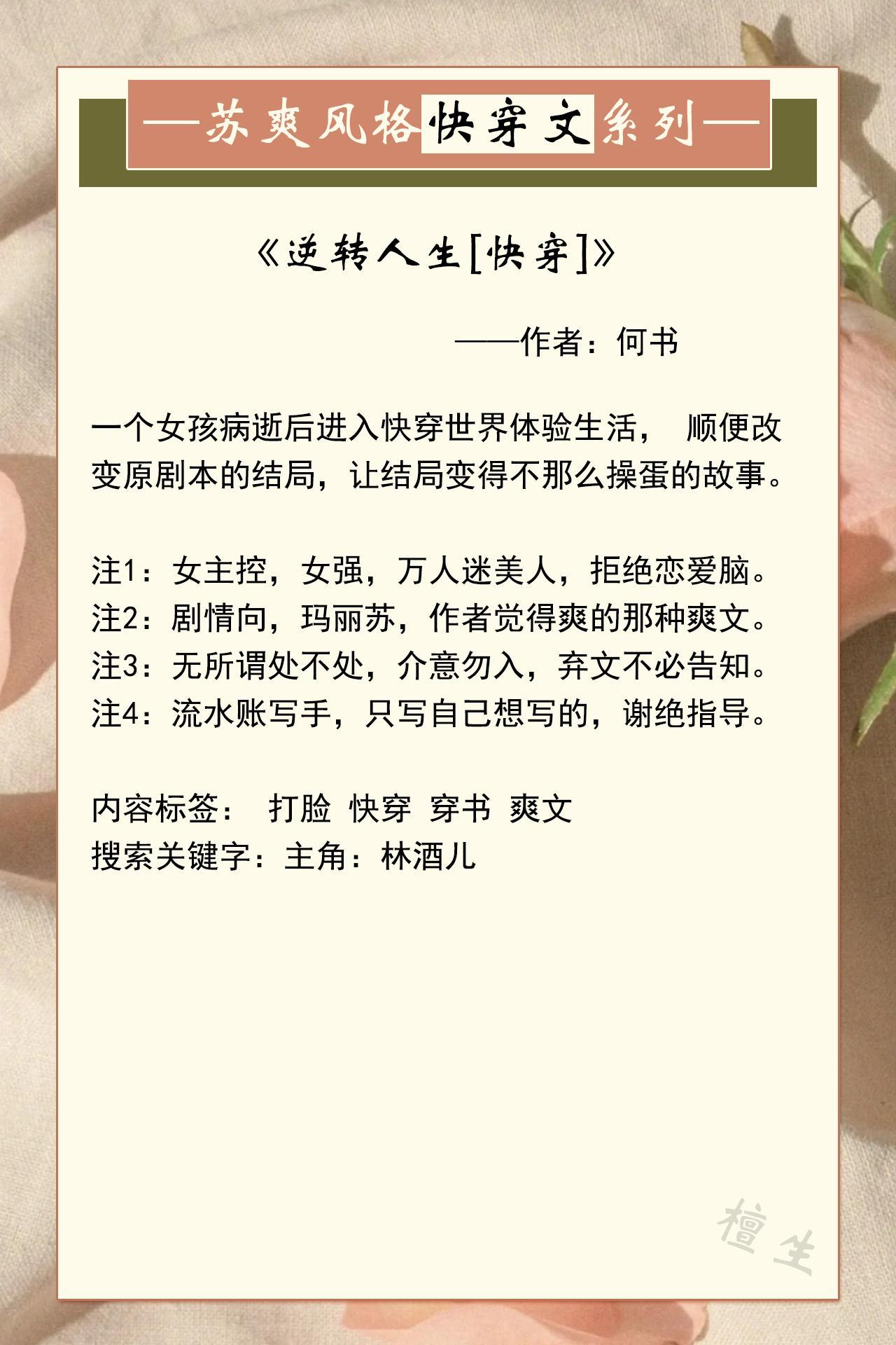 简评:女主林酒儿自幼体弱多病,渴望拥有一具健康的身体,然而现代很残酷,在十八岁时将她带离了人间。机缘巧合下,女主获得了一个重生的机会,并且只要她完美完成系统发布的任务,便能重获健康的身体。她所要做的就是书中的世界里,帮助那些不公平待遇厌世轻生的宿主们解决他们所遇到的难题和挫折,健康且自由地生活着。这篇快穿文很励志向,传递给人“无论身处何种逆境也要勇敢面对挑战”的正能量,很多小单元有警醒意义。