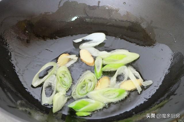 步骤2:铁锅上火烧热,放食用油,放葱段和姜片炸香;