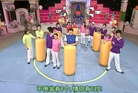 游戏规则:情侣跟着音乐跳舞,在音乐结束之后抱住不倒翁,没有抱到的就淘汰。