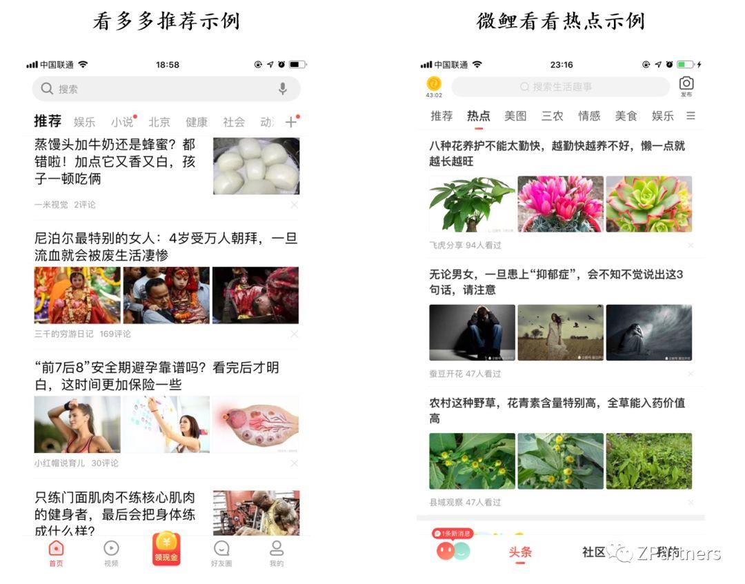 ZP发现不同新闻资讯类app的内容差异明显。今日头条内容最全也最正,趣头条内容更猎奇,百度旗下的“看多多”更养生,中华万年历推出的“微鲤看看”更三农。不同的精神食粮送给了不同口味的读者,大家各取所需。
