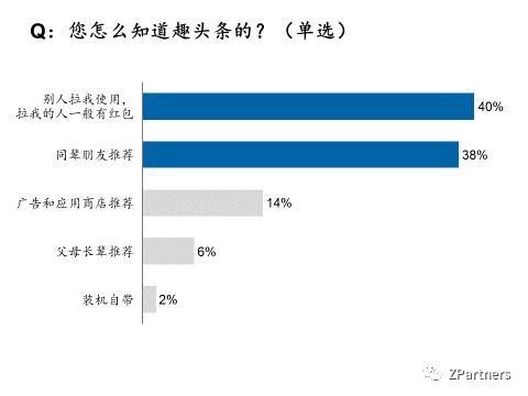 ZP调研发现,约85%趣头条用户因推荐而使用——又是社群的力量。其中一半是被拉人头拉过来的(发展下线后上线有现金奖励),另外一半通常被告知自己可以有注册奖励——最终还是金钱的力量。