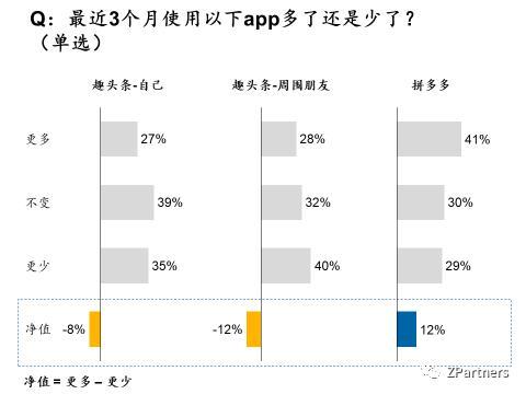 趣头条用户使用时长减少的多、增加的少,他们观察周围的朋友也一样。结果是使用趋势的净值(更多减更少)为负值。