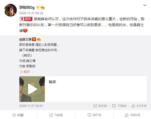 2020年,千万级粉丝的网红郭聪明,与音乐才子薛之谦合作了一首歌曲《耗尽》。