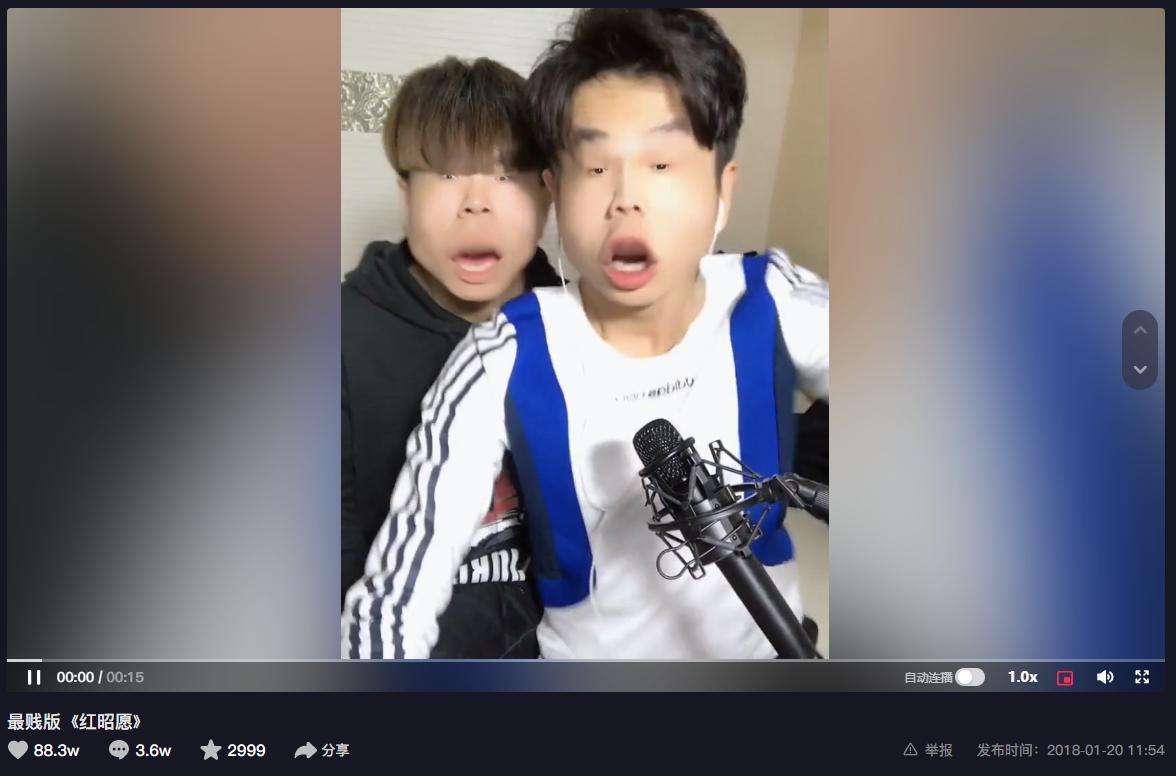 贱贱的表情,加上搞怪的变脸特效。郭聪明在都抖音上发布的第一个作品,就是这首“最贱版”《红昭愿》。