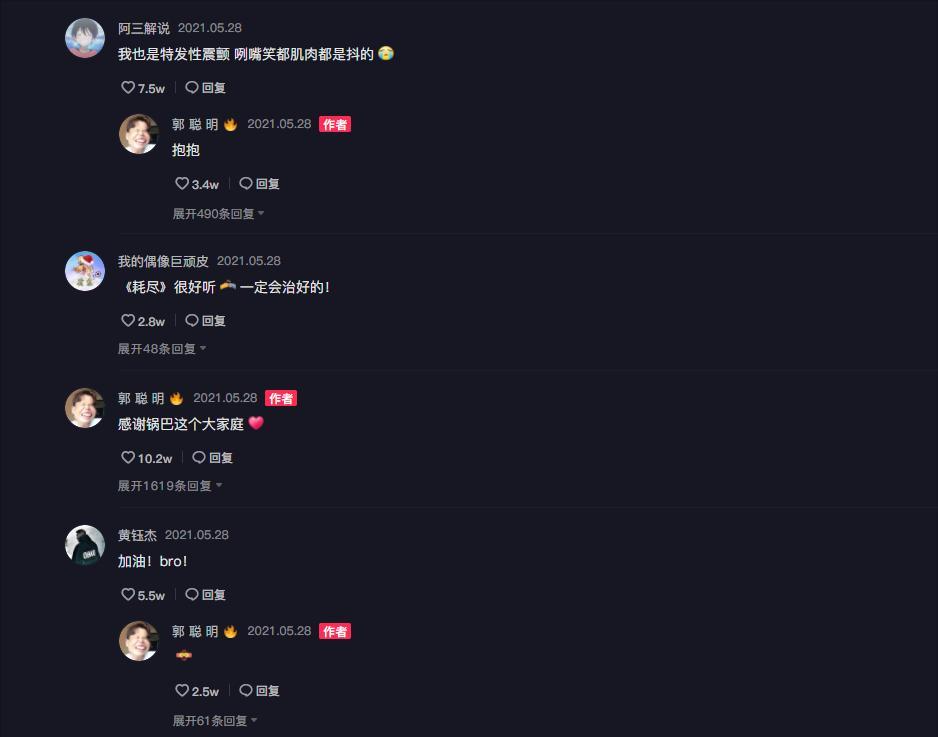 也有网友表示自己也得了同样的病,郭聪明也暖心地回复:“抱抱”,祝愿他坚强乐观。