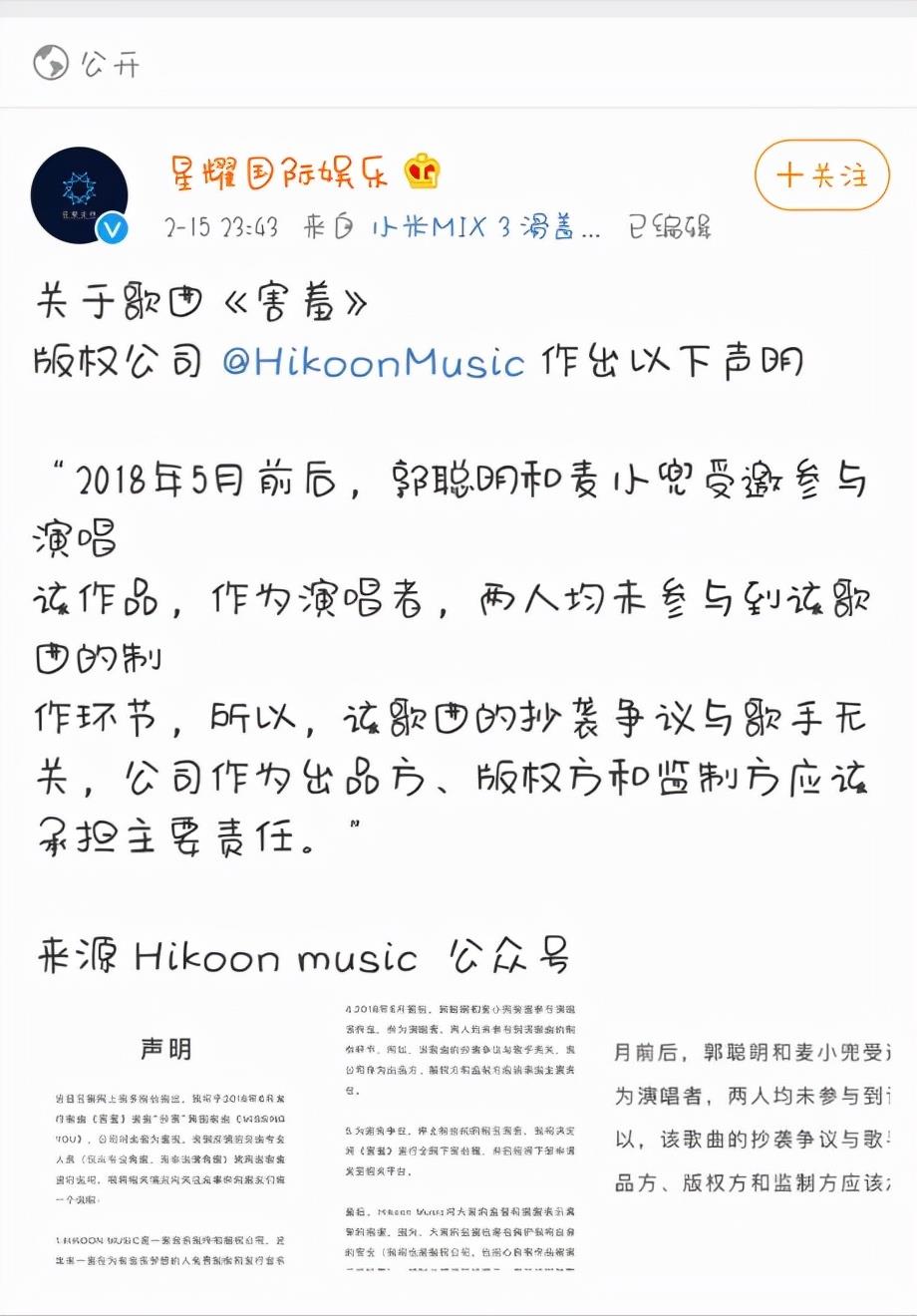 之后,他与麦小兜一起合唱的歌曲,还一度陷入了抄袭风波。然而面对这些质疑声,郭聪明一开始并没有回应,也没有反击。颇有“任尔东西南北风,我自岿然不动”的意思。后来越闹越大,公司便出了一个与歌手无关的声明。