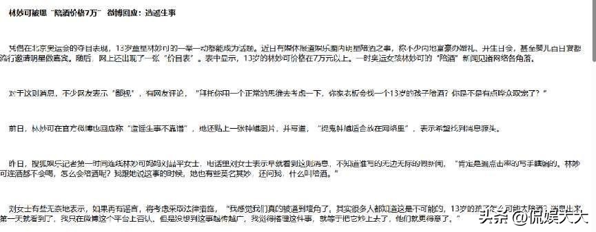 2013年,一张所谓“女星陪酒价目表”开始在网上流传,令人难以置信的是,年仅13岁的林妙可名字赫然在列。